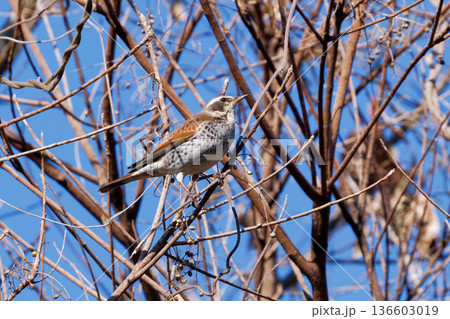 ヤマハゼの残された果実を採餌するヒタキ科ツグミ