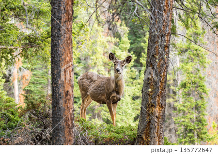 森の中に佇むミュールジカ(Odocoileus hemionus)