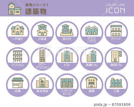 建物シリーズ1 建築物 カラーラインアイコンのセット