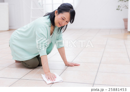 床の拭き掃除をするミドル〜シニア女性