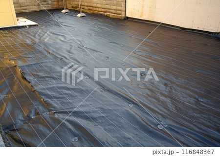 防草シートを敷いた地面