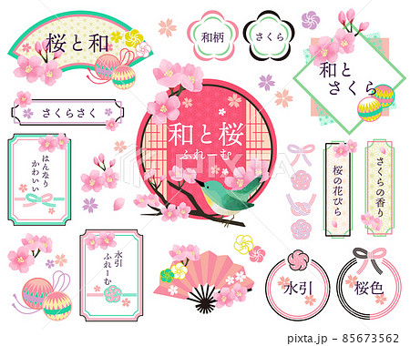華やかでかわいい桜と和のフレーム素材のベクターイラスト素材/枠/リボン/見出し/ひな祭り