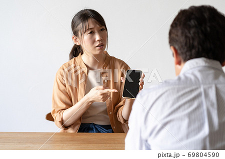夫に携帯を見せる妻