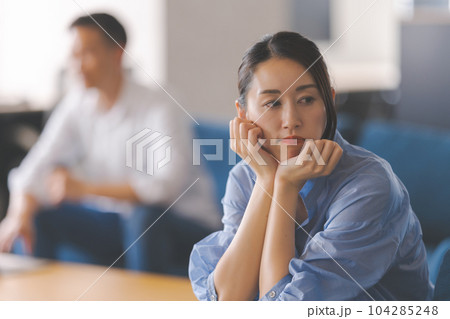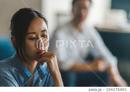 リビングのソファーに座りながら悩み事を相談する夫婦,カップルの若いアジア人