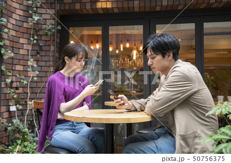 自分のスマートフォンを持ち反対方向を向く男女