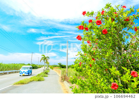 夏の沖縄 ハイビスカスが咲き乱れる道