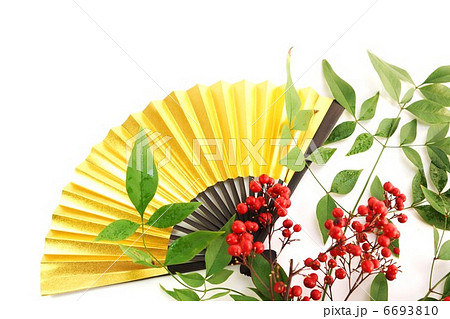 年賀状素材・南天の実と葉・金扇水平縦位置アップ白バック