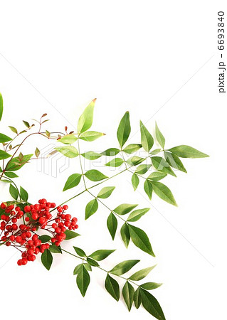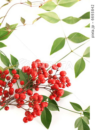 年賀状背景素材・南天の実と葉・白バック垂直横位置