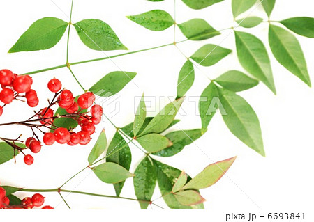年賀状背景素材・南天の実と葉・白バック水平横位置