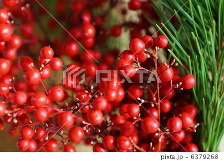 年賀状素材・たくさんの南天の実と松の葉・金和紙バック縦位置・ハガキ対応比