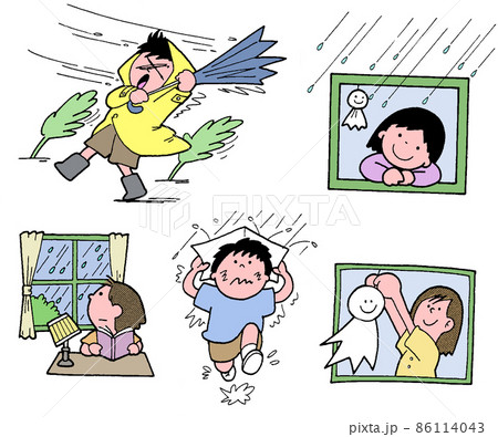 雨と風の中、傘が飛ばされそうになって危険な状態の男の子のイラスト