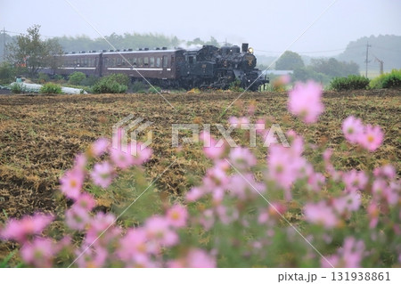 真岡鐵道「雨降りしきる中を走るSLもおか号」コスモス前景に