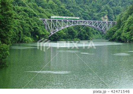 只見線「只見川第一橋梁と水面の雨滴と波紋」