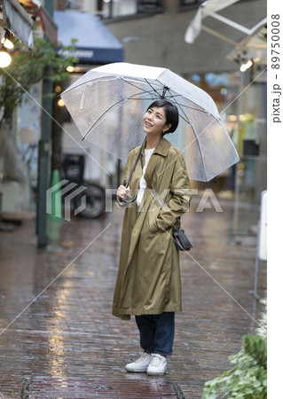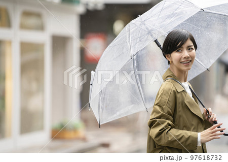 ビニール傘をさした笑顔の30代前半の女性 雨の日