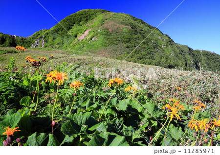 雨飾山山頂とマルバダケブキの花