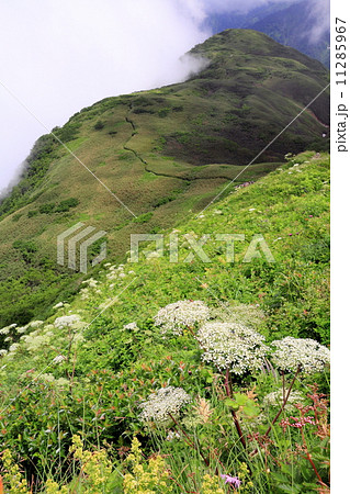 雨飾山山頂の高山植物群落と雲湧く登山道