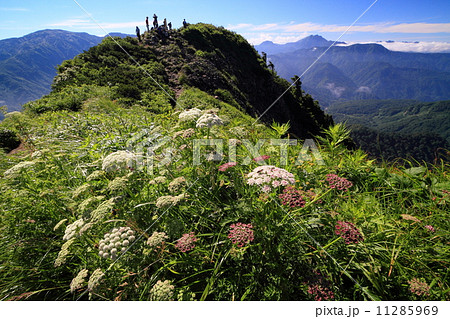 雨飾山の高山植物と山頂の登山者