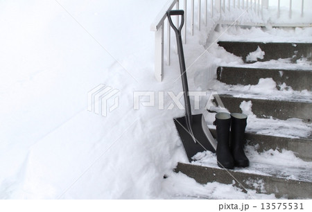 除雪用具 コンクリート階段に置いてある角スコップと長靴