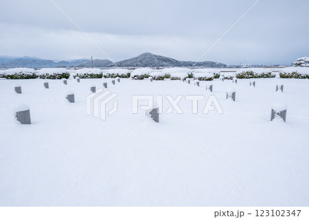 うっすら雪が積もった池のある庭園。岡山県津山市、大名庭園「衆楽園」