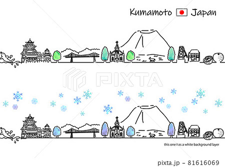 冬の熊本県の観光地の街並みシンプル線画セット