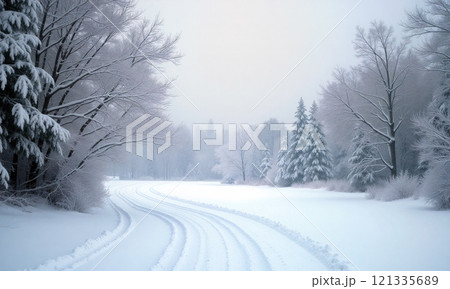 Serene snow-covered road leads through frosted trees and quiet winter landscape, capturing the cold beauty and calm of nature in pristine white.