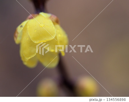 雨の降る12月に可愛らしく咲き始めた黄色い蝋梅(ロウバイ)の花