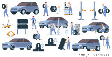 Car tires black icons. Wheel disk with rubber pressure gauge and mechanic tools, automobile tire repair service flat icons. Vector isolated set