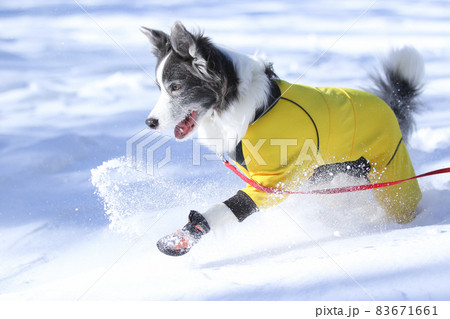 雪山の中にいる防寒着を着た雪を楽しむボーダーコリー