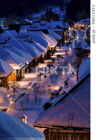 雪景色の大内宿 雪まつり 雪灯篭のある街並み 福島県下郷町