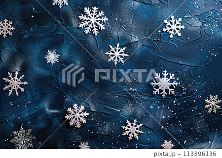 Glowing snowflake snow star pattern design on dark blue background. Winter decoration concept