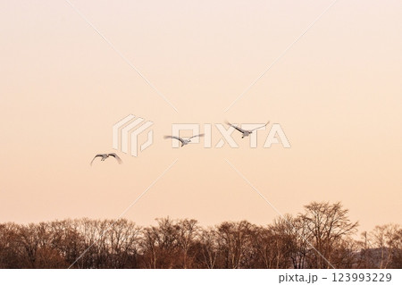 夕陽に向かって美しく飛ぶタンチョウ