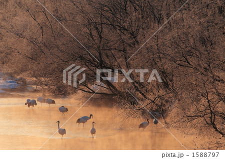 川霧に浮かぶ夜明けのタンチョウ鶴 音羽橋 鶴居村