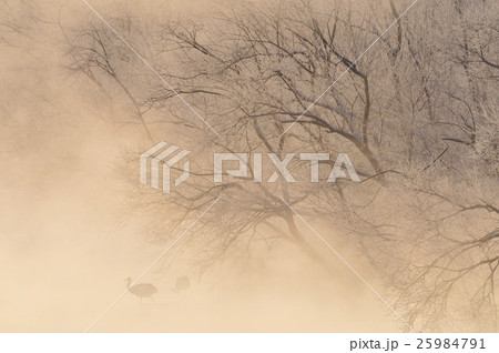 川霧に浮かぶ夜明けのタンチョウ鶴 音羽橋 鶴居村
