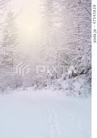 Nature winter background. Snowy forest with country road covered with snow. Pine trees covered with snow. Winter nature. Christmas background