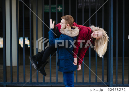 Guy on the shoulder is carrying the girl, winter outdoors.
