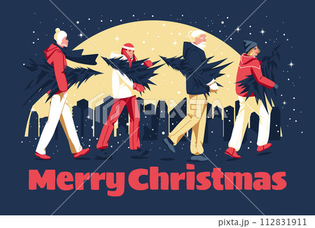 four different people carry Christmas trees against the background of a dark city. Greeting card. Celebrate the New Year. Vector flat illustration