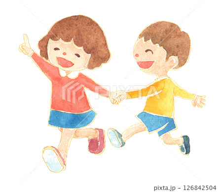 水彩風 手をつないで走る子どものイラスト 保育・教育・知育素材