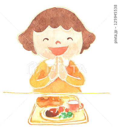 水彩風 笑顔でごちそうさまをする子ども 保育・教育・知育素材
