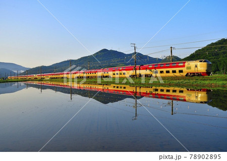 朝日を浴び田んぼに映るサンライズエクスプレス