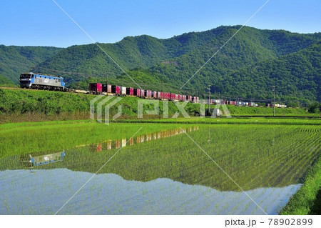 快晴の中、田んぼに映り込みながら走る貨物列車2