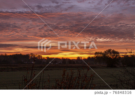 Image of a colorful and high-contrast sunrise with bright cloud formations taken in Germany