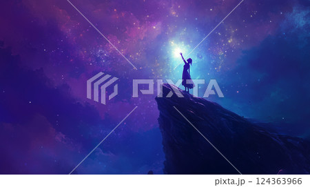 スピリチュアル空間幻想的な空に手を伸ばす少女のシルエット