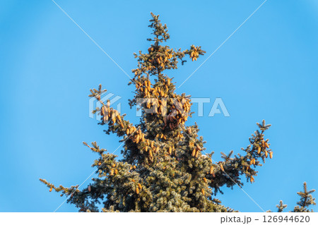 Green spruce branches with needles and cones against a blue sky in winter. Many cones on spruce. Fir tree.