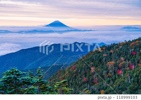 【長野県】朝の光に照らされた紅葉が美しい、国師ヶ岳から望む富士山