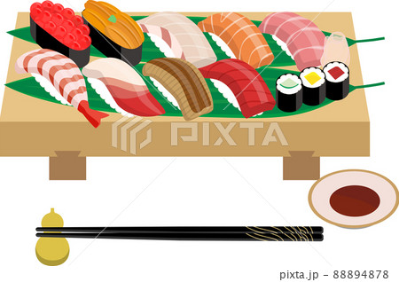 握り寿司と巻きずしの青海波背景のイメージイラスト