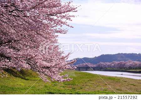 【島根県】快晴下の斐伊川堤防桜並木と願い橋(雲南市)