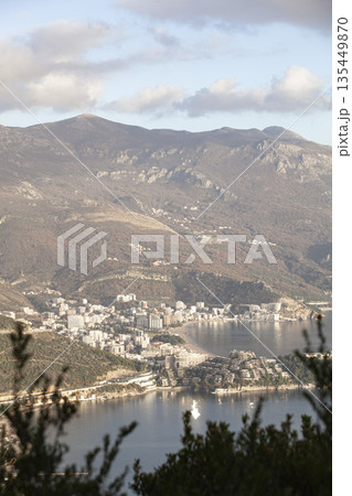 An elevated view of the popular resort town of Budva. The image captures the coastline, beaches, modern urban architecture, and majestic mountains under a cloudy sky.