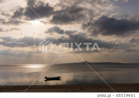 沖縄のビーチから眺める海と小舟・雲間からの太陽と遠くの伊江島