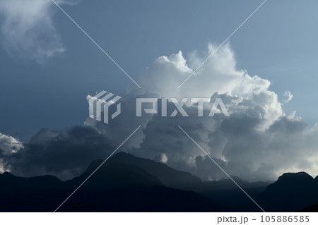 北杜市白州町、夏空に大きく高く沸き立つ入道雲