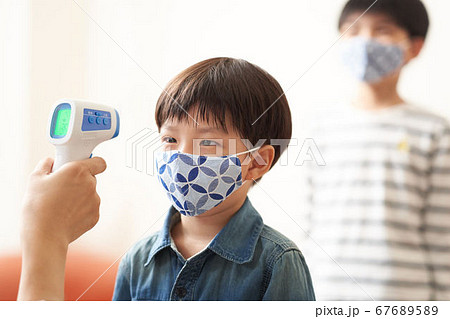 非接触式体温計で検温される男の子
